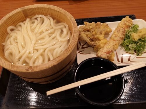 丸亀製麺でランチ♪ 釜揚並(290円)とちくわ天(130円)と雪国まいたけ天(160円)です。